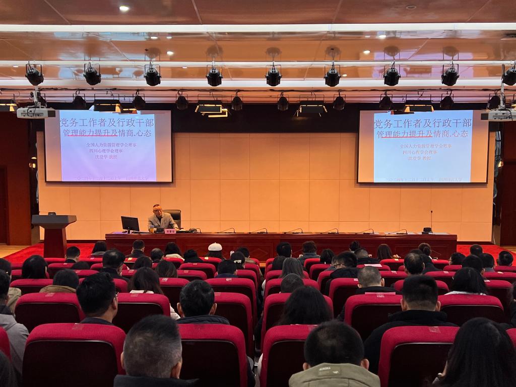 成都信息工程大学教授沈登学作题为《党务工作者及行政干部管理能力提升与情商心态》专题讲座